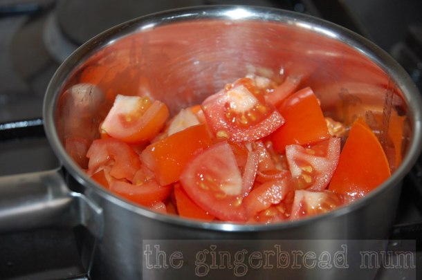 Cook over a medium-low heat (a light bubbling boil) for approx. 10 mins or until the tomatoes have softened. If it’s looking a bit dry, add more water; if you don’t think the sauce is thick enough, cook it for longer to reduce it.