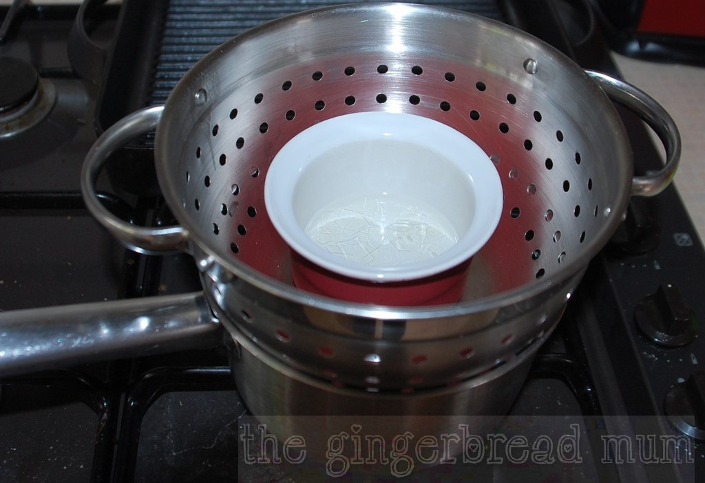 While you’re waiting, bring a small saucepan of water to the boil then drop the heat to low.