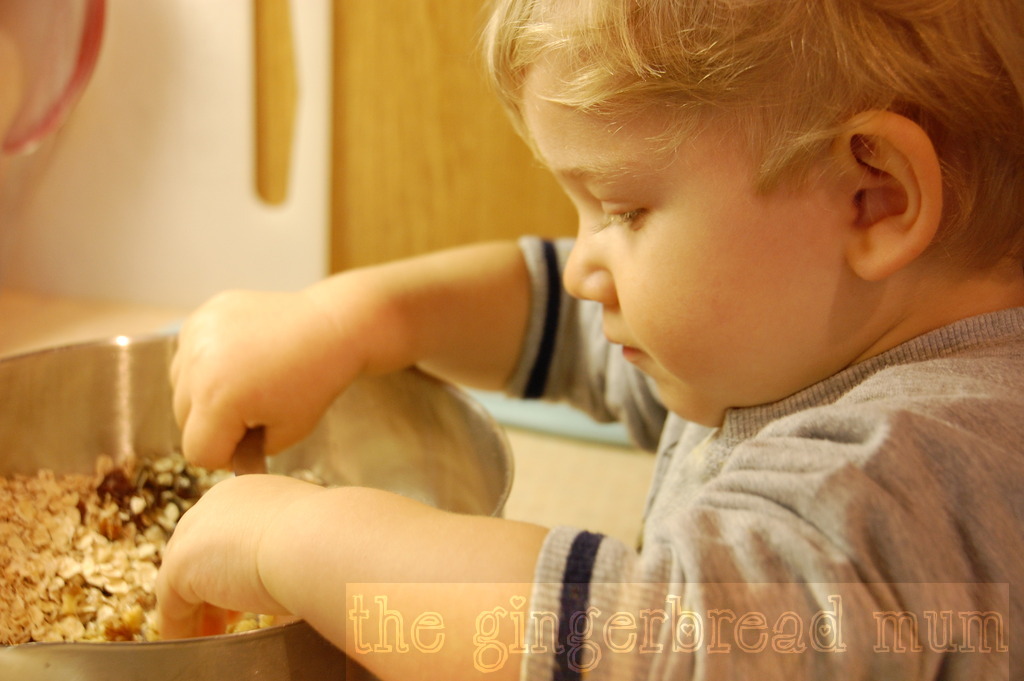 Nicholas had a great time helping me make these. He seemed to be excited by how many little bowls of ingredients there were to be mixed into the oats. He’s getting better at stirring (not a lot went on the floor) and is also understanding the importance of tasting as you go 🙂