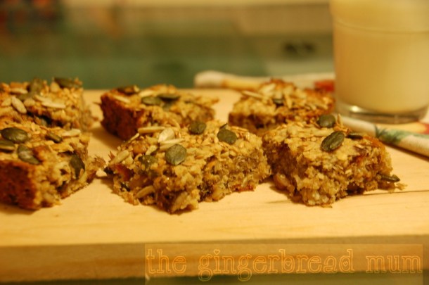 I’ve been looking at flapjack recipes for a while, trying to find a variation that isn’t full of sugar or dripping with butter. They’re a lovely filling snack and you can easily add nutritious ingredients such as seeds or dried fruit, but also adding heaps of sugar cancels out the goodness for me.