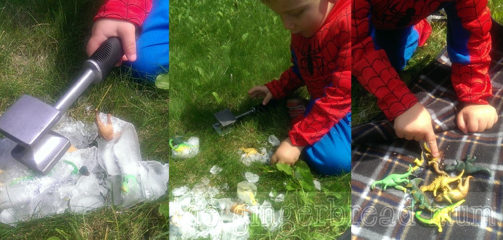 When I did buy some small dinosaurs, I put some in an empty ice cream container, covered them in water and froze them. The next day we excavated them. I’m not sure what Nicholas was more excited about – discovering dinosaurs in the ice or getting to use the heavy meat tenderiser to bash them out!
