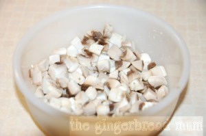 Chop the mushrooms into cubes about 0.5cm. Put them in a small microwave-safe bowl with the water and cook on medium for 5 mins.