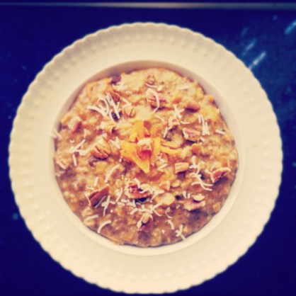 Any cooked fruit works great swirled through cooked porridge (peaches, plums, apricots, strawberries). I don’t add sugar while stewing the fruit, but check the taste of the porridge adding some vanilla for sweetness or honey. A small pinch of ground ginger also works well.